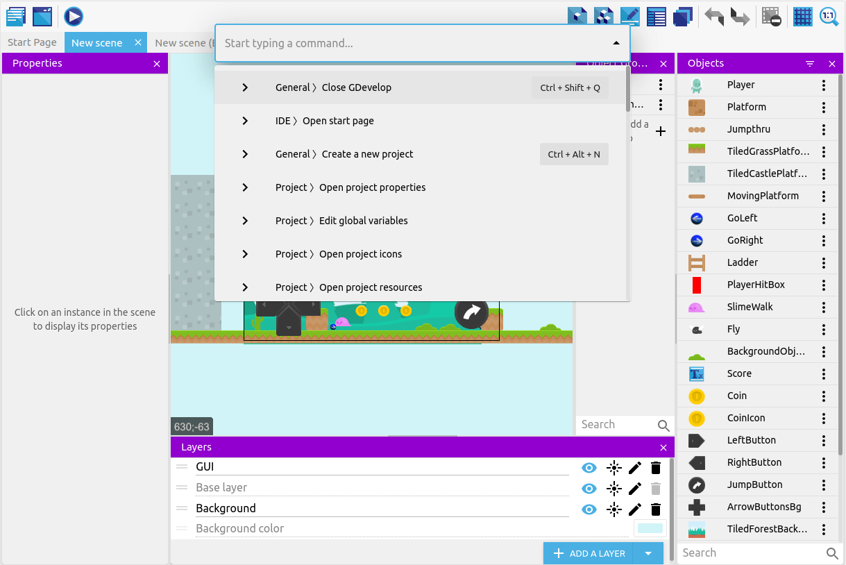 GDevelop provides keyboard shortcuts that allow you to quickly navigate to different areas. You can customize them to fit your preferences.