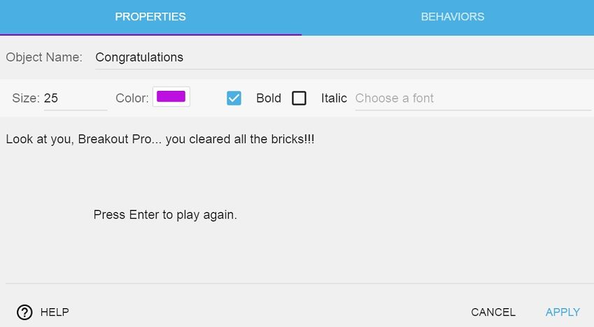 • In the Text field, type a congratulatory message (e.g. Congratulations! You cleared all the blocks!). Also include a line telling the player "Press Enter to play again."